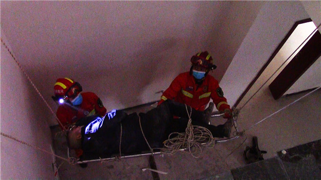 消防員到達(dá)現(xiàn)場(chǎng)后發(fā)現(xiàn),事發(fā)建筑內(nèi)設(shè)置有一個(gè)深約4米的地下室,一樓入戶門附近與地下室留有一個(gè)6平方米大小的空洞,老人不慎踩空墜入。老人受傷嚴(yán)重,無(wú)法翻身,不時(shí)傳來(lái)呻吟聲,現(xiàn)場(chǎng)情況十分緊急,救援刻不容緩。