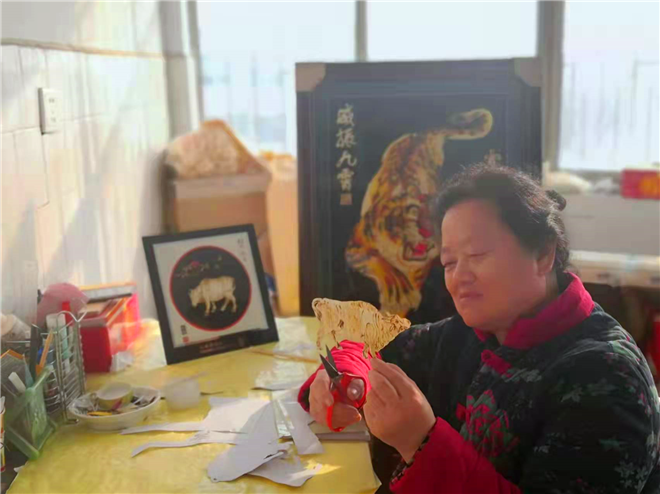 “虎在中國是極其有力量的動物?!?月25日,秸稈畫技藝代表性傳承人、中國民間文藝家協(xié)會國家級會員王春梅告訴記者,她耗時近半年創(chuàng)作的秸稈畫《威震九霄》已完成。記者看到,作品中的老虎長半米有余,威風凜凜、活靈活現(xiàn),用平面的方式展現(xiàn)了立體的效果?!?022年是虎年。在古代,老虎就以威風凜凜的形象被視為勇氣的象征,來表現(xiàn)軍人的勇敢和堅強。古時候關于將士大臣的美譽就有虎將、虎臣、虎士等?!蓖醮好氛f。