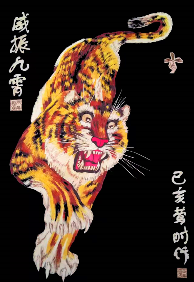 據王春梅介紹,畫中老虎身上所有的虎毛全部是用秸稈先染色,然后把這些染好顏色的秸稈用剪刀剪成人頭發(fā)絲一半粗細的虎毛形狀,再用鑷子一根一根地層層嵌上去,需要盤絲的毛發(fā)所花費的功夫更是成倍地增加。最終所呈現(xiàn)出來的老虎栩栩如生,極具觀賞性。