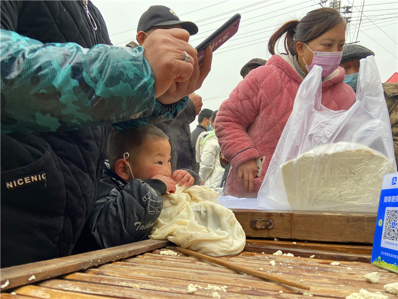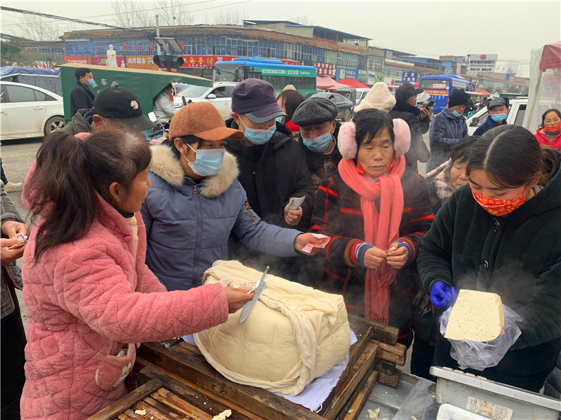 在固墻鎮(zhèn)的集市上,“桂枝熱豆腐”攤位前的顧客絡(luò)繹不絕。“給我來50塊錢的豆腐”“我要20斤,先給我切豆腐吧”“我要30斤,多少錢”……人群將豆腐攤里三層外三層圍了起來,從人群外朝里看看不見豆腐,只看到豆腐攤里冒出來的團(tuán)團(tuán)熱氣。“等了半個(gè)小時(shí)了,剛才那一盒豆腐沒輪到我就賣完了,這才搶到手。”附近的村民楊大爺拿著剛買的豆腐高興地說。“我從鹿邑來的,姐姐在里面擠著買豆腐,我在這兒等她呢。”9歲的張家瑞說,她每年放寒假都會(huì)和家人一起到固墻來探親,過年的時(shí)候逛逛集市,順便買些豆腐帶回鹿邑。