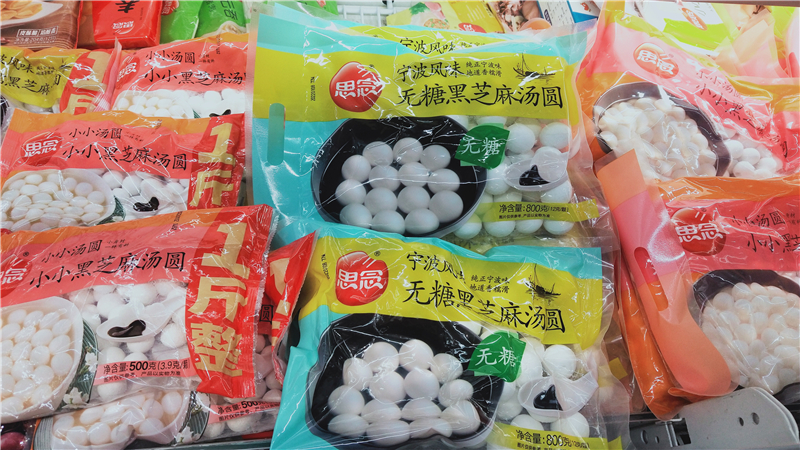 在一家超市內(nèi),除了有傳統(tǒng)口味的芝麻餡、花生餡湯圓,新派口味湯圓,如黃桃餡湯圓、菠蘿餡湯圓、無糖湯圓亦被放在亮眼的位置。