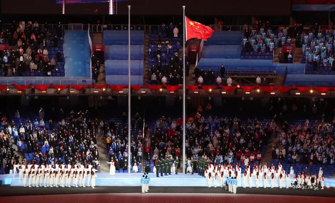 這是中華人民共和國國旗在開幕式上升起。新華社記者 杜瀟逸 攝