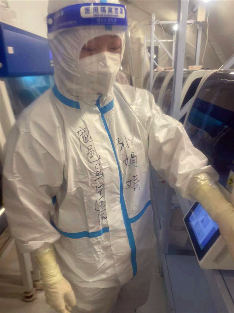 3月18日,孫娟娟及同事進(jìn)駐了長春疫情最嚴(yán)重的九臺區(qū),隨行的還有方艙實驗室。次日,孫娟娟和同事們進(jìn)行了防護(hù)培訓(xùn),隨即開始核酸檢測實驗。孫娟娟穿著密不透風(fēng)的防護(hù)服,身心各種莫名的滋味都涌上來了。當(dāng)她想到這每一個標(biāo)本后面是一雙雙期盼的眼睛、一個個焦慮的家庭,她不禁為自己打氣——加油!我們就是這場疫情的偵察兵,要把偵察到的情報準(zhǔn)確無誤地傳遞過去。