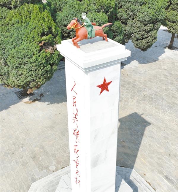 沈丘縣烈士陵園正中的人民英雄紀(jì)念碑頂端,有座雕塑——一匹高頭大馬揚(yáng)蹄飛奔,一位軍人策馬揚(yáng)鞭。這是沈丘人民對朱彬烈士的最高禮贊。