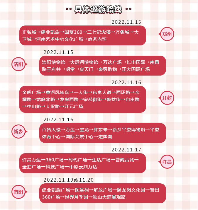 巡游活動(dòng)將會(huì)陸續(xù)在開封、洛陽(yáng)、新鄉(xiāng)、許昌、南陽(yáng)五市展開,途經(jīng)各個(gè)地市商圈及市中心地帶,馬上參考我們下方的路線,追著我們的車隊(duì)一起跑起來(lái)吧!