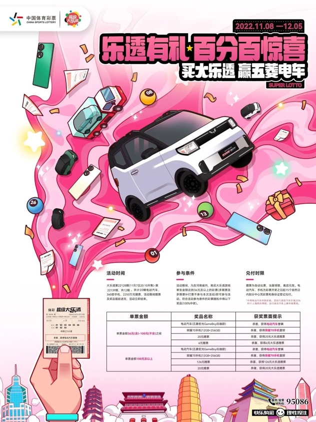 巡游期間,河南體彩大樂(lè)透的購(gòu)彩抽獎(jiǎng)活動(dòng)也將同步開啟,大樂(lè)透第22128期(11月7日20:10開售)-第22139期,共12期,期期均有大禮派送,頭獎(jiǎng)可獲得五菱mini GameBoy玩咖版一輛!
