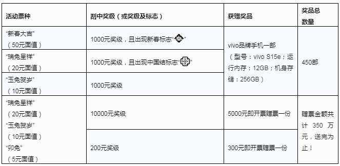 活動期間,購彩者在我省任一體彩銷售實(shí)體店購買指定活動票種,若單張彩票刮中符合獎勵條件的獎級(或獎級及標(biāo)志),經(jīng)實(shí)體店終端兌獎設(shè)備(IVT或BCR)成功完成獎金兌付及促銷兌獎掃描后,另可獲贈相應(yīng)的獎品。獎品數(shù)量有限,送完為止,詳見下表: