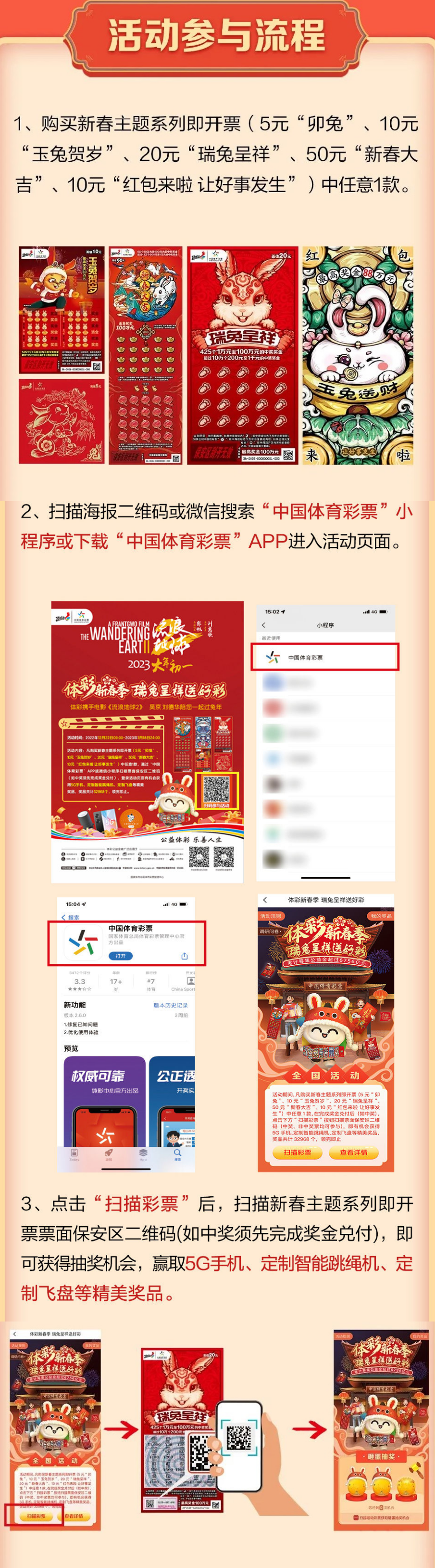 2.“體彩新春季”全國促銷活動細(xì)則詳見“中國體育彩票”微信小程序或“中國體育彩票”APP活動頁面,或登錄中國體彩網(wǎng)查詢相關(guān)信息。