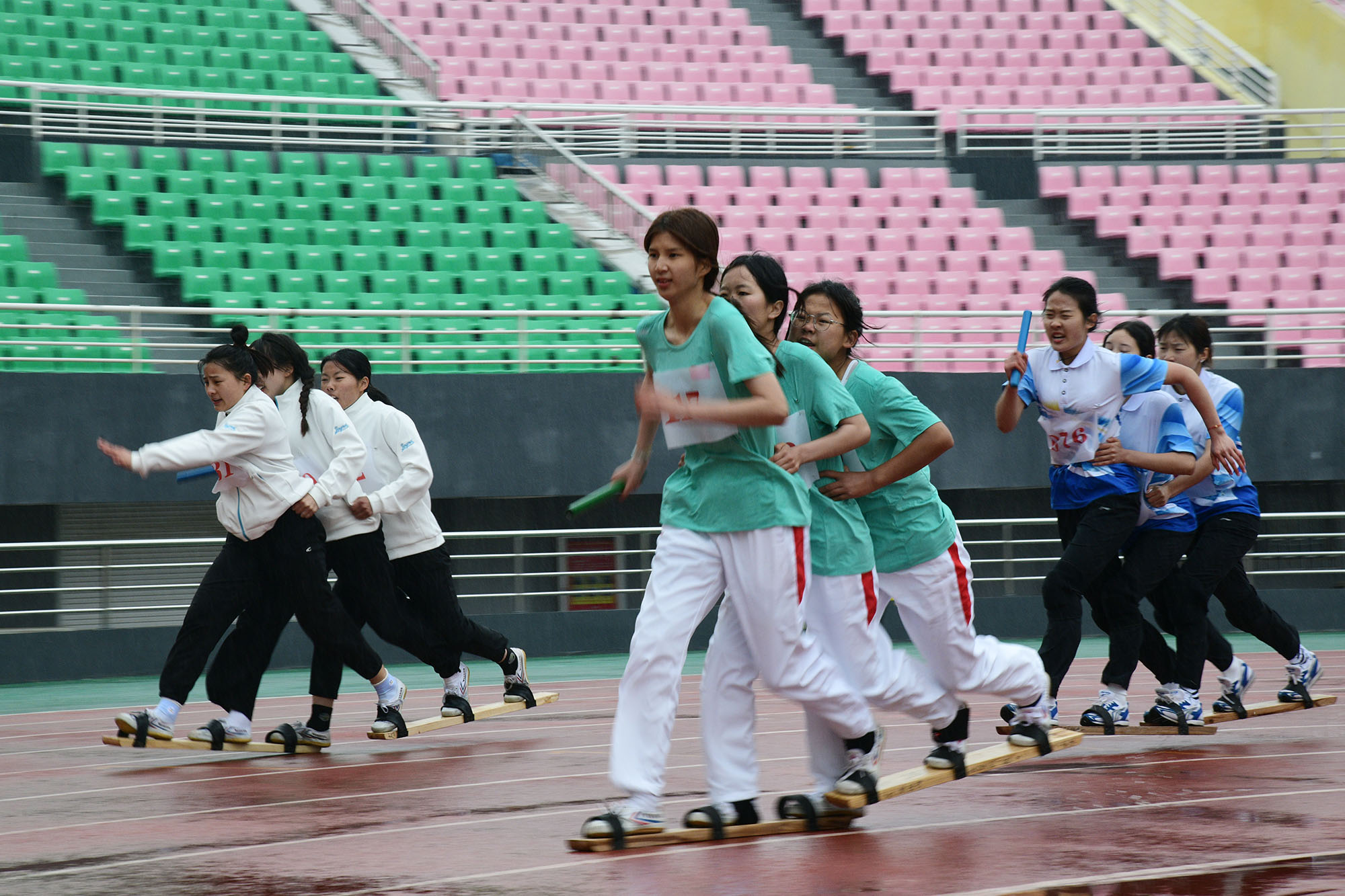 三人共穿一雙板鞋,板鞋競速項(xiàng)目考驗(yàn)著運(yùn)動員的默契度,需要達(dá)到“三人合一、人板合一”的程度。在雨天,板鞋與賽道、腳底與板鞋之間都容易打滑,一定程度上制約著運(yùn)動員的發(fā)揮。