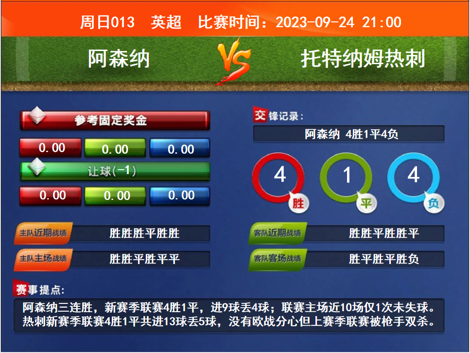 比賽時(shí)間:2023-09-24 21:00賽事提點(diǎn):阿森納三連勝,新賽季聯(lián)賽4勝1平,進(jìn)9球丟4球;聯(lián)賽主場近10場僅1次未失球。熱刺新賽季聯(lián)賽4勝1平共進(jìn)13球丟5球,沒有歐戰(zhàn)分心但上賽季聯(lián)賽被槍手雙殺。