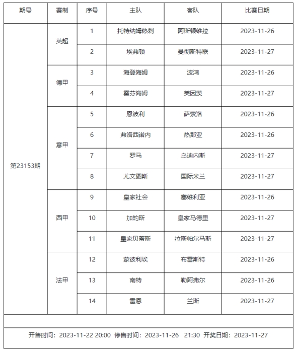 足球彩票勝負(fù)游戲(14場(chǎng)和任選9場(chǎng))第23153期賽程: