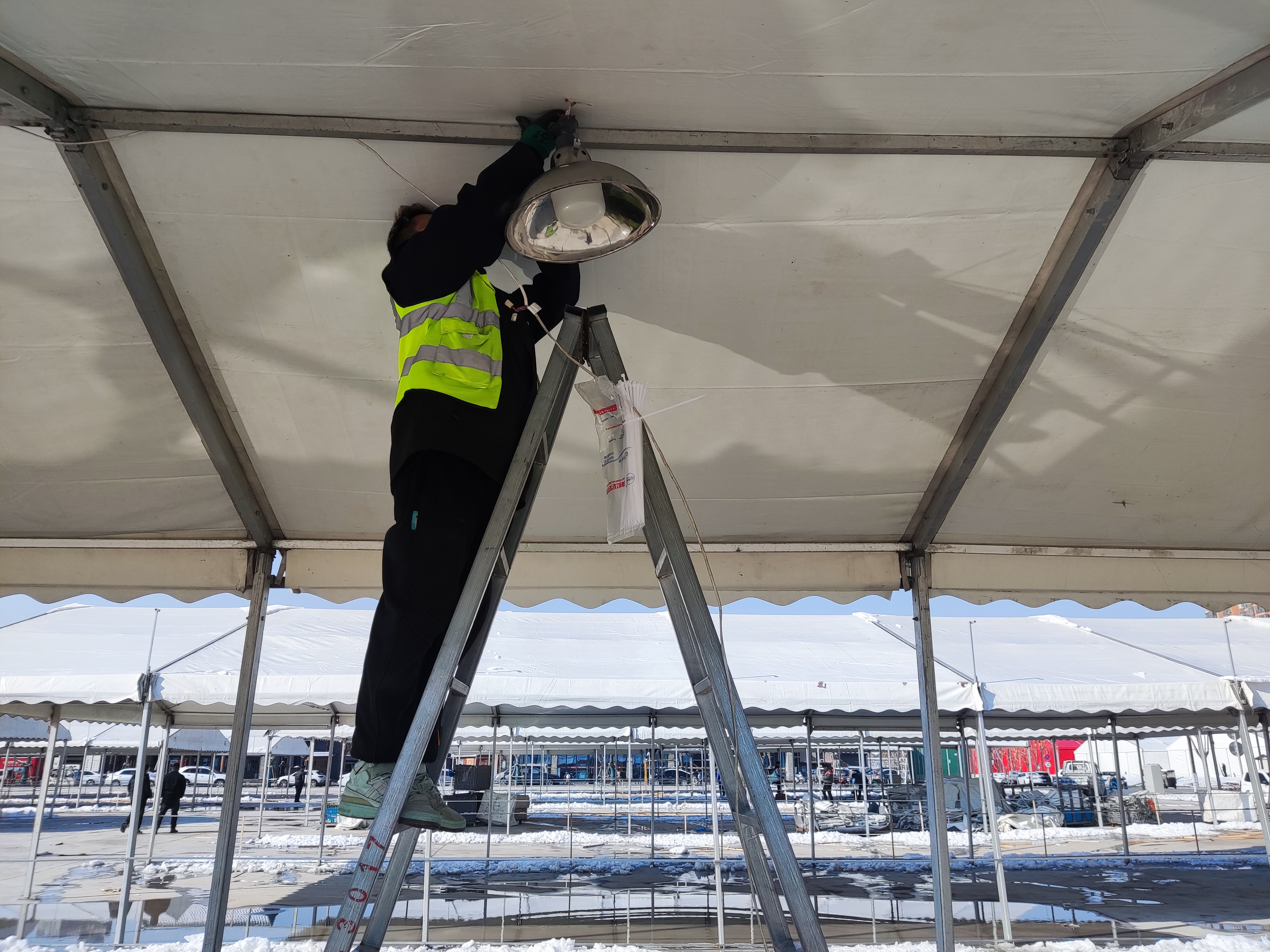 1月23日記者在現(xiàn)場看到,展區(qū)大篷內(nèi),工人正在做水電安裝、焊接等掃尾工作。