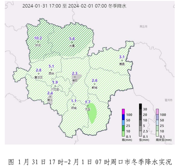 1月31日17時(shí)—2月1日7 時(shí),我市出現(xiàn)小雨轉(zhuǎn)雨夾雪、北部地區(qū)中到大雪天氣。截止到1日7時(shí)。國(guó)家站累計(jì)雨雪量(毫米)為:扶溝10.2、太康5.8、西華5.1、鹿邑3.1、黃泛區(qū)2.8、鄲城 2.6、商水 2.4、淮陽(yáng) 2.3、川匯區(qū) 1.9、沈丘1.7、項(xiàng)城1.1。各地區(qū)7時(shí)雪深(厘米):太康5、扶溝4、西華4、黃泛區(qū)1、鹿邑1。