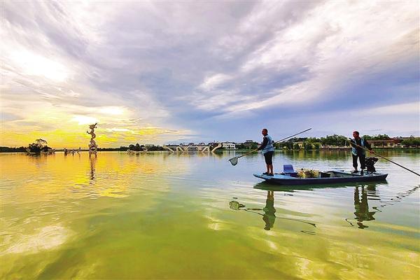 8月13日,當(dāng)?shù)谝豢|晨光穿過(guò)云層,水云間的淮陽(yáng)萬(wàn)畝龍湖景色怡人。此時(shí),一艘打撈船也開(kāi)始“搜尋”湖面漂浮的垃圾。正在晨練的一位市民說(shuō):“正是環(huán)衛(wèi)工人日復(fù)一日、年復(fù)一年默默無(wú)聞的工作,才換來(lái)我們身邊美好的生活環(huán)境,他們才是最美的風(fēng)景?!庇浾?杜欣 攝