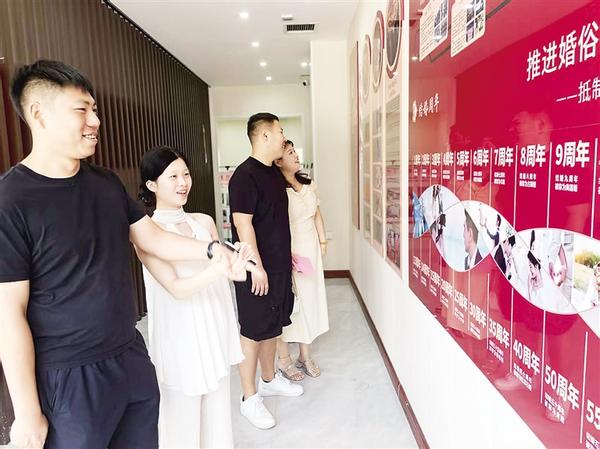 近年來,沈丘縣加大精神文明建設(shè)力度,通過舉辦文化大講堂等活動(dòng),在廣大群眾中形成“天價(jià)彩禮不可取,鋪張浪費(fèi)最可恥,陳規(guī)陋習(xí)危害大”的共識,許多年輕人在耳濡目染中受到熏陶,新事新辦蔚然成風(fēng)。圖為8月29日,農(nóng)歷七月初七,結(jié)婚登記的新人在婚史展板前駐足。
