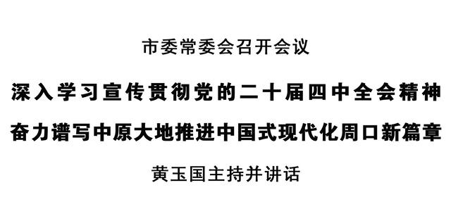 會議強調(diào),要把學(xué)習(xí)宣傳貫徹黨的二十屆四中全會精神,作為各級黨委(黨組)理論學(xué)習(xí)中心組集體學(xué)習(xí)的重要內(nèi)容,納入黨校(行政學(xué)院)教育培訓(xùn)的必修課程,做到黨員干部全覆蓋;各級宣傳部門要充分利用各種形式和手段,做好權(quán)威解讀和分眾化傳播,讓廣大黨員干部群眾聽得懂、記得住、落實在行動上;要把貫徹落實全會精神與習(xí)近平總書記在河南考察時重要講話精神緊密結(jié)合起來,聚焦“兩高四著力”,錨定“1+2+4+N”目標(biāo)任務(wù)體系,落實市委“16232”總體工作思路,突出抓好重點項目建設(shè)和招商引資、農(nóng)業(yè)農(nóng)村、城市規(guī)劃建設(shè)管理、文旅發(fā)展、民生實事、社會治理等重點工作,全力以赴打贏“十四五”收官戰(zhàn),高質(zhì)量編制“十五五”規(guī)劃,切實把全會部署轉(zhuǎn)化為推動現(xiàn)代化周口建設(shè)的實際行動。
