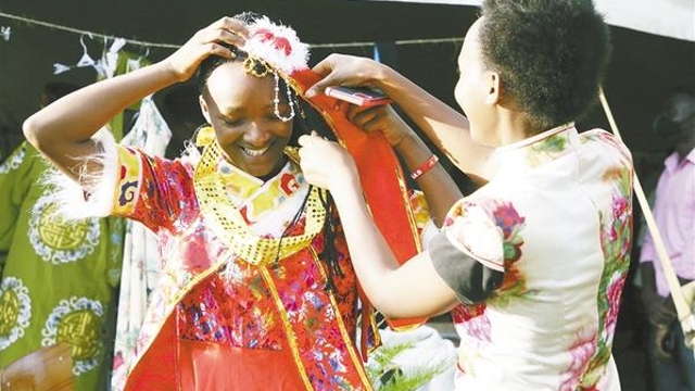 11月10日,學生在盧旺達卡永扎試穿中國服飾?!?a href="http://www.dwzyxx.com/content/2021-11/13/content_959142.html" target="_blank" >[詳細]