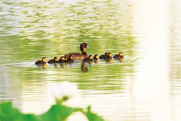 6月24日,世界極度瀕危物種、國家一級保護野生動物青頭潛鴨現身淮陽龍湖。當日,一只青頭潛鴨帶著10只可愛的“鴨寶寶”在湖中緩緩游弋。有關方面人士告訴記者,種種跡象可以證明:青頭潛鴨已在淮陽龍湖國家濕地公園安家落戶、繁衍生息。