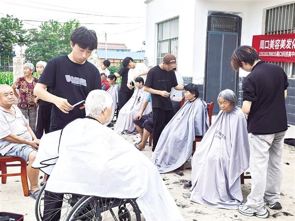 “我還是頭一次享受理發(fā)師上門(mén)服務(wù),太高興了。”6月30日下午,沈丘縣卞路口鄉(xiāng)張保元村村民馬桂榮撫摸著剛剪過(guò)的頭發(fā),臉上樂(lè)開(kāi)了花。當(dāng)日,張保元村駐村第一書(shū)記劉會(huì)見(jiàn)組織周口科技職業(yè)高中的劉宇、李杰等7名志愿者來(lái)到張保元村開(kāi)展義剪活動(dòng)。