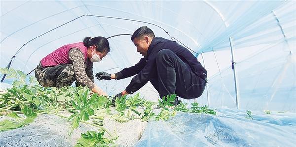 3月15日,在扶溝縣江村鎮(zhèn)江北村現(xiàn)代農(nóng)業(yè)產(chǎn)業(yè)園的大棚里,農(nóng)戶在管理西瓜苗。該園區(qū)占地500余畝,主要種植麒麟美都西瓜、太陽花水果玉米、優(yōu)質(zhì)菠菜,預(yù)計(jì)每畝年綜合收益1.2萬元,輻射帶動周邊200余名群眾在家門口就業(yè)。