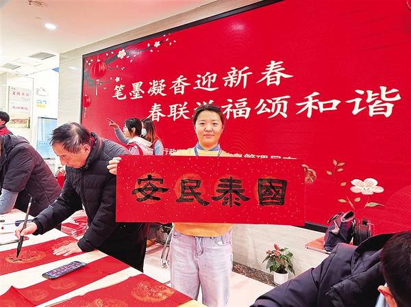 1月20日,扶溝縣政務(wù)服務(wù)中心一名工作人員展示剛收到的手寫春聯(lián)。連日來,我市數(shù)千余名書法家、書法愛好者為市民寫春聯(lián)、送“?!弊郑蜕厦篮玫淖8?。