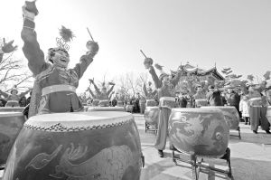 ▲2月24日,在山東煙臺毓璜頂廟會上,老年鑼鼓隊(duì)進(jìn)行威風(fēng)鑼鼓表演。當(dāng)日,在山東煙臺毓璜頂廟會上,民間藝人們帶來了大秧歌、威風(fēng)鑼鼓、舞龍舞獅等民俗表演,為市民和游客獻(xiàn)上精彩紛呈的傳統(tǒng)文化大餐。新華社發(fā)