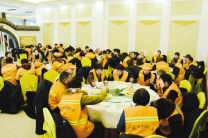 本報訊 (記者 徐啟峰 通訊員 劉巍 文/圖) 2月17日,農歷臘月二十九上午,愛心人士韓平為川匯區(qū)環(huán)衛(wèi)工人送去棉大衣,并邀請環(huán)衛(wèi)工人共進午餐(如圖)。
