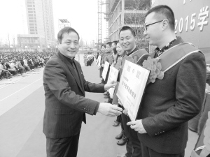 3月8日上午,淮陽一高萬余名師生在學校操場隆重舉行新學期表彰大會。大會回顧了2014~2015學年第一學期的各項工作,對感動校園學生、優(yōu)秀班主任、優(yōu)秀員工、優(yōu)質課教師等24個項目近500人次進行了表彰。淮陽縣有關領導及淮陽一高全體師生參加了本次表彰大會。圖為王業(yè)生校長為獲獎人員頒發(fā)獎狀。(豆紀鋒 攝)