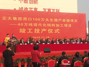 正大集團(tuán)周口100萬頭生豬產(chǎn)業(yè)鏈項(xiàng)目竣工投產(chǎn)儀式現(xiàn)場(chǎng)。