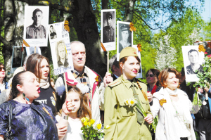 ?、?月9日,在拉脫維亞首都里加,人們手持在衛(wèi)國戰(zhàn)爭中犧牲的親人照片參加紀念衛(wèi)國戰(zhàn)爭勝利70周年活動。