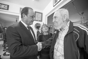 菲德爾·卡斯特羅會(huì)見奧朗德   5月11日,在古巴首都哈瓦那,古巴前領(lǐng)導(dǎo)人菲德爾·卡斯特羅(右)會(huì)見到訪的法國總統(tǒng)奧朗德(左)。當(dāng)日,法國總統(tǒng)奧朗德在古巴哈瓦那大學(xué)演講。他在演講中呼吁美國解除對(duì)古巴的經(jīng)濟(jì)封鎖。奧朗德于10日晚抵達(dá)哈瓦那,開始對(duì)古巴進(jìn)行為期3天的訪問,他是冷戰(zhàn)結(jié)束后首位訪問古巴的法國國家元首。