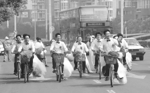 鄭州:騎著單車娶新娘 5月23日,新郎帶著新娘騎行在鄭東新區(qū)。 當(dāng)日,由鄭州晚報等單位主辦的“幸福相約”鄭州青年集體婚禮在鄭東新區(qū)舉行,共有16對新人參加。婚禮上,新郎騎著自行車迎娶新娘,倡導(dǎo)低碳、簡約婚禮。新華社記者 趙鵬 攝