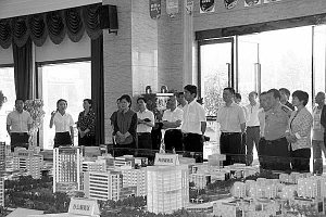 羅文閣在商務中心區(qū)規(guī)劃沙盤前聽取項目進展情況匯報。丁宇濤 攝