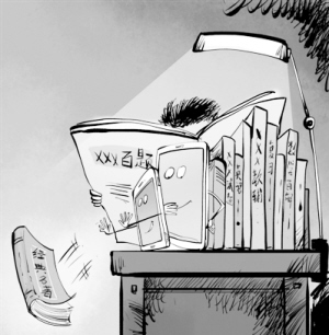 記者調(diào)查發(fā)現(xiàn),在繁重的課業(yè)負(fù)擔(dān)下,不少初高中學(xué)生所讀書籍越來(lái)越單一,教輔書占了絕大比例。智能手機(jī)的普及,各類社交平臺(tái)的出現(xiàn),更是讓學(xué)生沉溺于淺閱讀。相反,拿起名著、對(duì)話經(jīng)典等深層次閱讀的情況,卻不容樂(lè)觀。這正是: