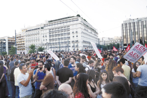 7月13日,民眾在希臘雅典參加集會(huì),抗議財(cái)政緊縮措施。新華社發(fā)