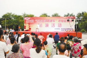 7月13日,沈丘縣“百姓宣講直通車”進基層宣講首場演出在該縣中華槐園千字文廣場舉行,舞蹈、戲曲、小品、大鼓書等多樣化的藝術(shù)形式,為前來游玩休閑的市民獻上了一道豐厚的精神大餐,讓大家在娛樂之余,對黨的新理論新政策有了更多的了解。圖為節(jié)目演出現(xiàn)場。(邵永成 攝)